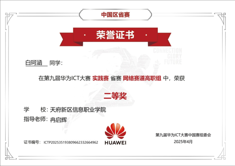 近日,天府新区信息职业学院新华三银河ICT产业学院学子在第九届华为ICT大赛实践赛省赛创下佳绩,罗政、白珂涵、周芯淼三名同学在段鹏飞、冉启辉两位老师的指导下,凭借扎实的专业技能,在激烈的竞争中脱颖而出,拿下实践赛“网络赛道高职组”两个二等奖一个三等奖,展现了学校在网络人才系统性培养方面的显著成效。